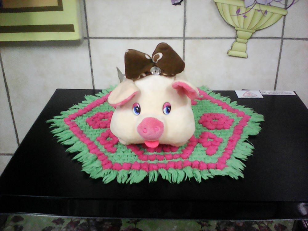 Прикольная плюшевая хрюшка сидит на микроволновке