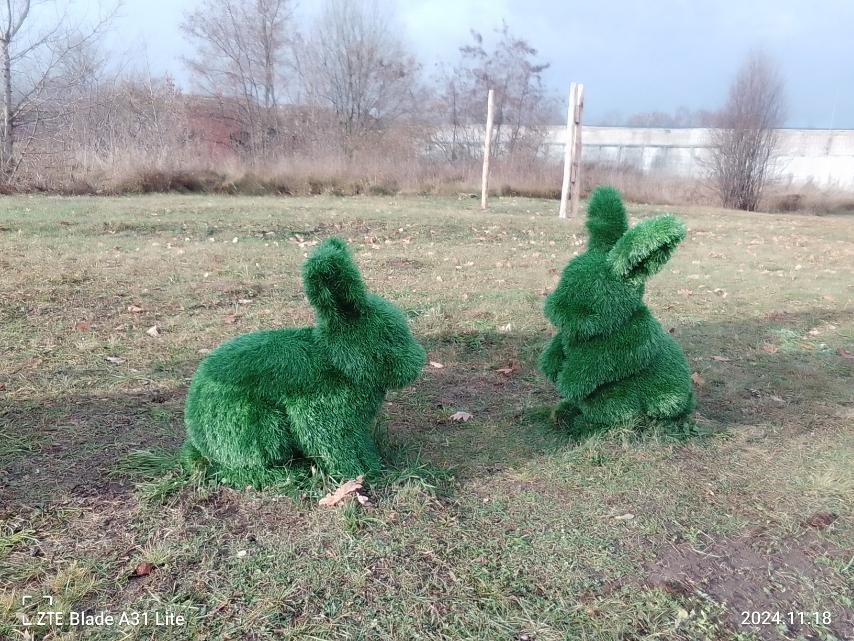 Очень прикольная инсталляция из зеленого пластика. Зайцы