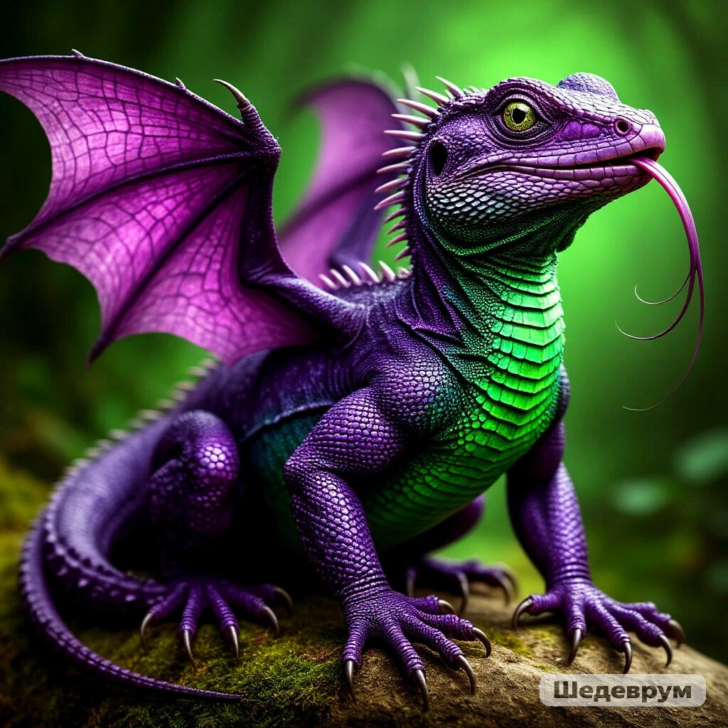 Странное мистическое существо похожее на ящерицу но с крыльями, когтями, пятачком, длинным как у змеи языком темно фиолетового цвета с ярко зелёным брюшком
