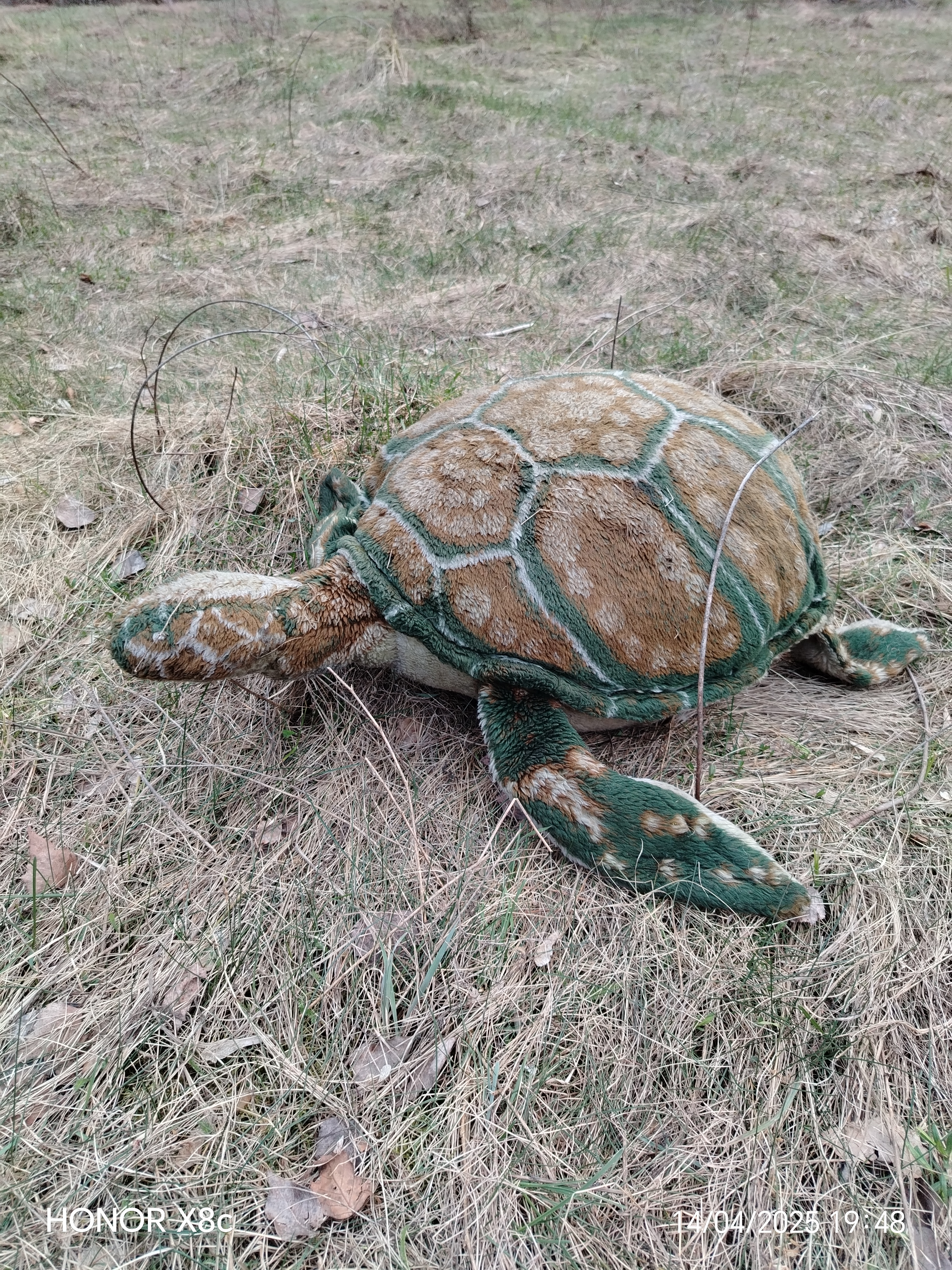 Это всего лишь плюшевая игрушка черепаха. Но как же она реалистично смотрится вечером на лесной опушке.