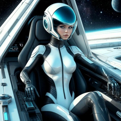 Футуризм. Девушка космонавт из будущего в современном футуристическом скафандре в космическом шаттле