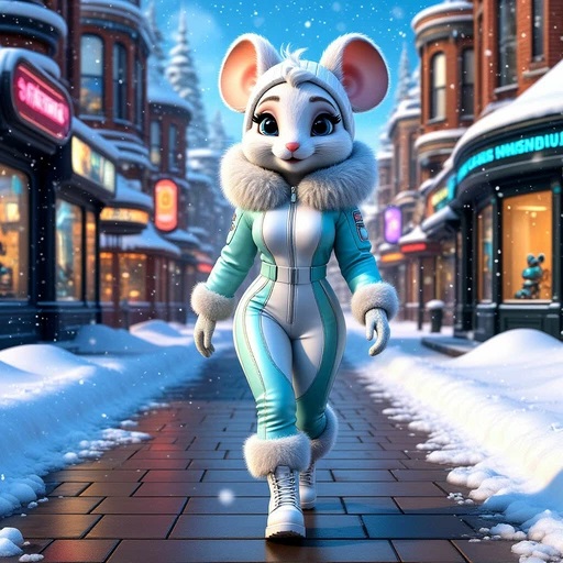 Фурри белая мышь. Дизайн одежды. Красивая, стройная, симпатичная девушка фурри белая мышь демонстрирует стильный модный зимний комбинезон из будущего