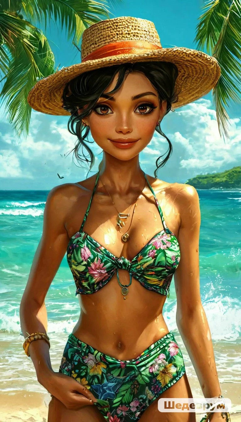Красивая нарисованная девочка в купальнике на тропическом пляже