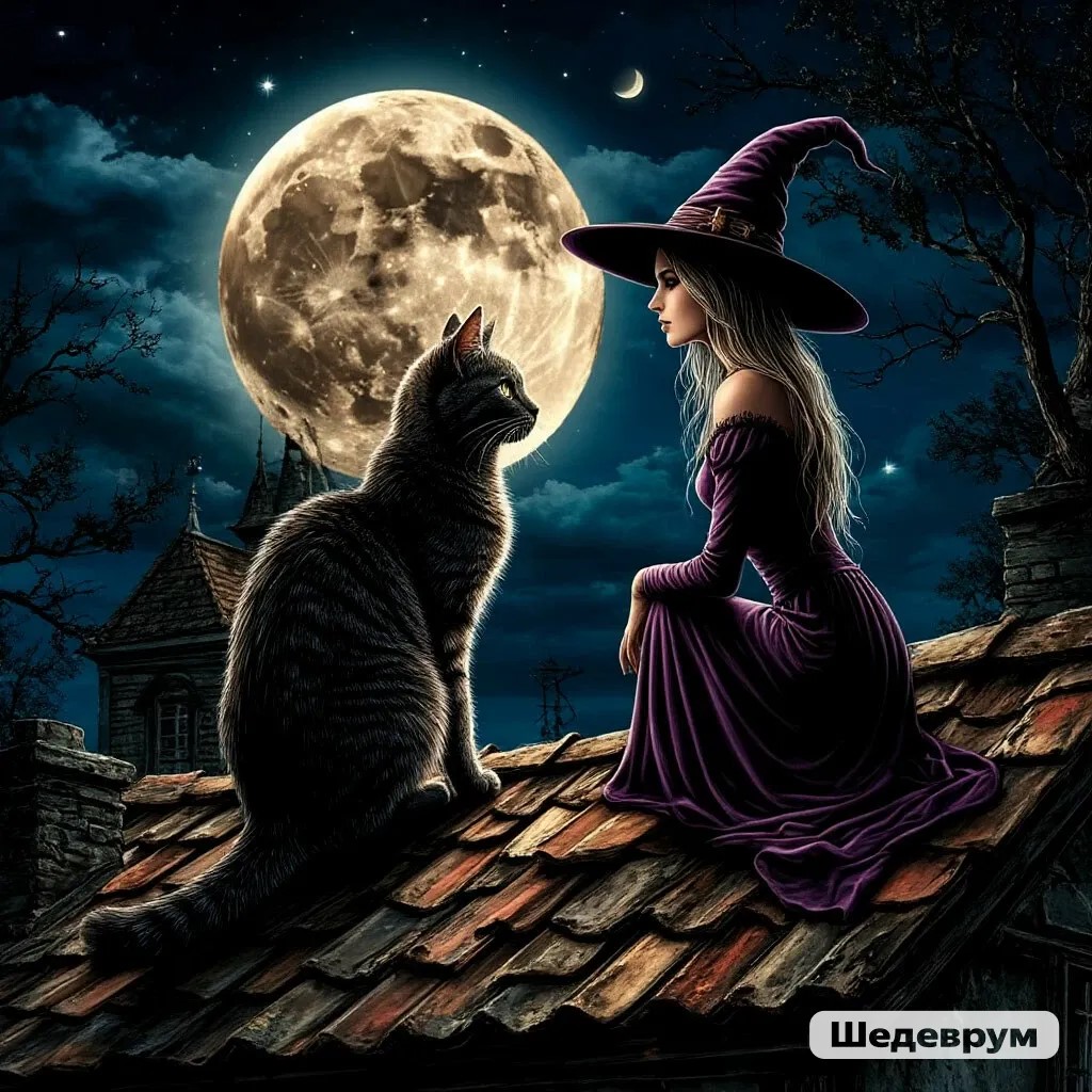 Огромный супер кот вместе с ведьмочкой отдыхают на крыше в лунном свете